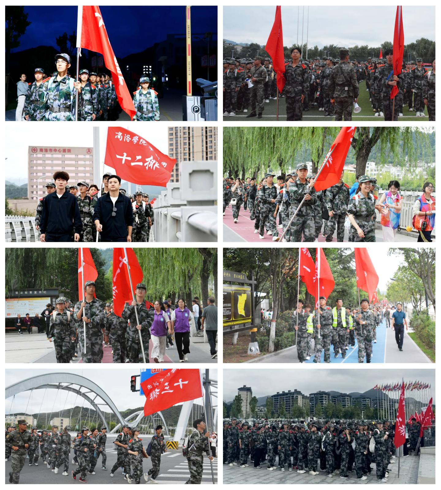 清晨5時30分,丹江校區參訓新生率先集合,6時整準時出發;北新街校區新生于6時30分自體育場整隊啟程。兩隊沿預定路線行進,于帆船公園順利匯合。匯合后,全體新生沿丹江河堤路繼續行進,途經望江樓、商洛市人民政府,最終抵達秦嶺博物館北側廣場,全程約15公里。全體新生行軍過程秩序井然、步伐整齊,展現出了良好的軍事素養和吃苦耐勞的精神風貌。