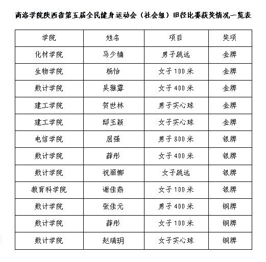 商洛學(xué)院師生在陜西省第五屆全民健身運(yùn)動(dòng)會(huì)(社會(huì)組)田徑比賽中獲得多項(xiàng)獎(jiǎng)勵(lì)