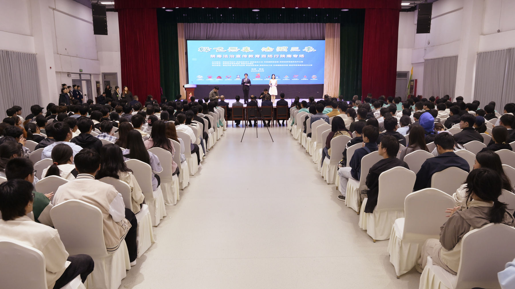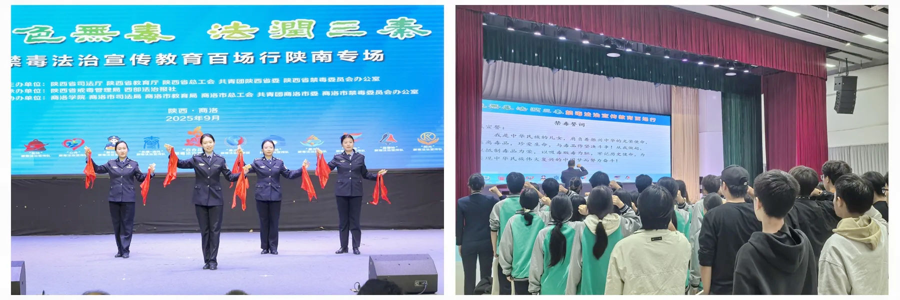 9月26日上午,由陜西省司法廳、教育廳、總工會、共青團陜西省委、省禁毒辦五部門聯合主辦的“綠色無毒 法潤三秦”禁毒法治宣傳教育百場行活動陜南專場在商洛學院舉行。校黨委副書記劉寶盈出席活動并致辭。陜西省戒毒管理局、商洛市司法局等相關部門領導,省市各級媒體、行業代表,以及商洛學院、商洛職業技術學院、商州區職業教育中心的師生代表共計500余人參加活動。