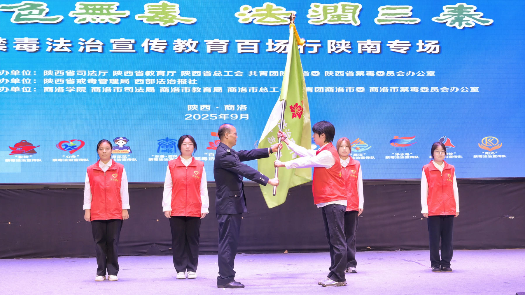 省戒毒管理局教育矯治處處長曹生明為我校志愿者團隊授“百合花禁毒法治宣傳團商洛學院志愿者”旗幟并贈送禁毒宣傳資料。百合花禁毒法治宣傳團干警代表陳俞戈及我校禁毒宣傳學生志愿者代表分別作表態發言。