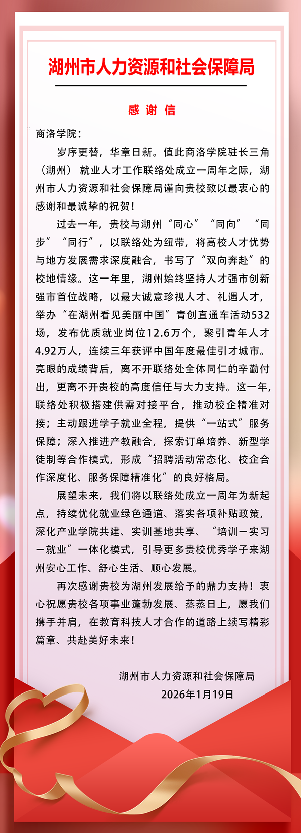 近日,湖州市人力資源和社會保障局向商洛學院發來感謝信,對學校以駐長三角(湖州)就業人才工作聯絡處為紐帶,將高校人才優勢與地方發展需求深度融合的工作實踐表示感謝,表達了與學校攜手并肩共同譜寫教育、科技、人才“三位一體”發展新篇章的良好愿景。