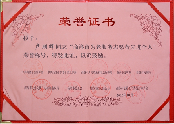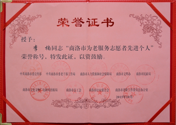 日前,中國老齡事業發展基金會發出《關于表彰全國首屆北京華夏惠眾養老產業投資有限公司等百家“敬老志愿服務模范單位”、溫向明等百名“最美敬老志愿者”、沈慧琴等千名“優秀敬老志愿者”的決定》。我校學生李楠、盧朋輝榮獲全國首屆“優秀敬老志愿者”榮譽稱號。同時二人也獲得商洛市表彰,被評為“商洛市為老服務志愿者先進個人”。