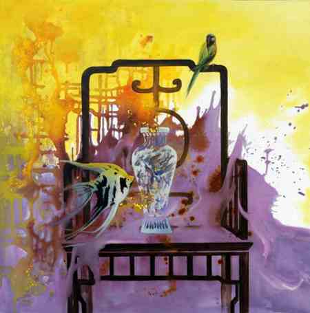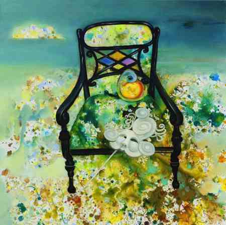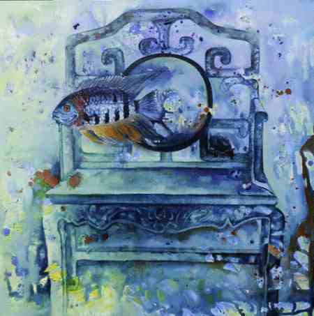 楊靜的作品兼具油畫(huà)的西方特質(zhì)與藝術(shù)家個(gè)人的東方屬性,多以意象風(fēng)景為主,魚(yú)、飛鳥(niǎo)、椅子、面具、鮮花常常成為畫(huà)面中的主要視覺(jué)符號(hào),意象化的表述方式是其繪畫(huà)語(yǔ)言特點(diǎn),獨(dú)具視覺(jué)張力的畫(huà)面背后蘊(yùn)藏著或浪漫或神秘或抒情的藝術(shù)獨(dú)白。《飛翔的魚(yú)》系列作品承載著對(duì)“自然”“生命”“自由”的渴望與理想,“飛翔的魚(yú)”穿梭于人間百象,描繪著在經(jīng)歷世事滄桑之后一顆滿懷“游”“逸”的心。作品把中國(guó)傳統(tǒng)文化中對(duì)莊子美學(xué)的研究與領(lǐng)悟融入到西方油畫(huà)的創(chuàng)新當(dāng)中,在中西文化的對(duì)撞中融匯出的獨(dú)特浪漫氣質(zhì)是楊靜油畫(huà)藝術(shù)走出國(guó)門(mén)并被認(rèn)可的實(shí)質(zhì)。