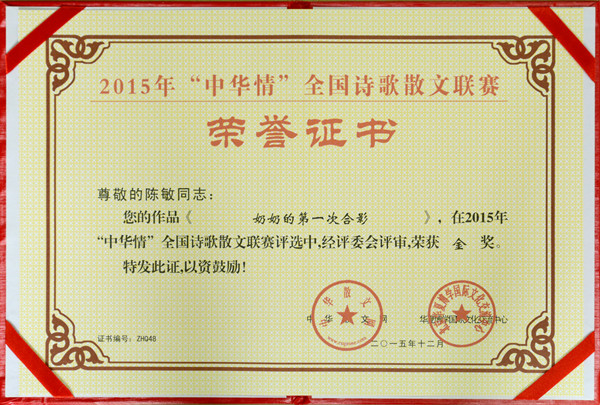 12月5日,2015年“中華情”全國詩歌散文聯賽評選結果揭曉,在國內外12085篇參評作品中,我校語言文化傳播學院教師陳敏創作的作品《奶奶的第一次合影》最終脫穎而出,榮獲2015年“中華情”全國詩歌散文聯賽金獎。