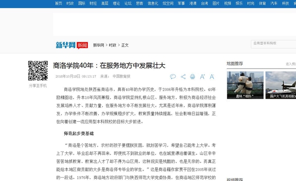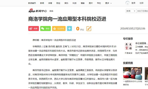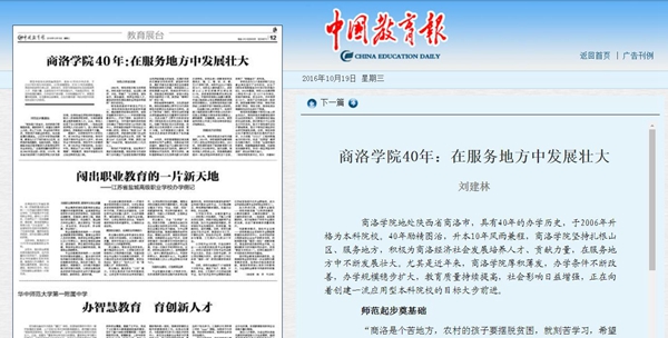 在我校建校40周年暨升本10周年之際,《中國教育報》、《陜西日報》、陜西省教育廳網站、《商洛日報》、商洛電視臺、新華網、新浪網、鳳凰網等23家媒體紛紛對我校改革發展成就進行了報道,共發表專題報道文章、視頻新聞37篇(條)。