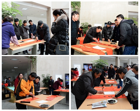 校書法家協會主席李尚民,書法家協會會員李中合、王思根、黃新春、葉玉印、張長林、王鎖鋒、祁志華等,在圖書館大廳展紙揮毫,為師生書寫、贈送春聯。慕名前來的師生絡繹不絕,爭相收藏自己喜愛的春聯,一張張紅紙上寫滿了新春的祝福語,大家笑顏綻放,為校園增添了濃濃的年味。