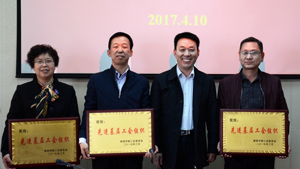 會議表彰了學校2016年先進基層工會組織、優秀工會干部、優秀工會積極分子。彭虎軍分別為獲獎集體和個人頒獎。經濟與管理學院分會等3個單位被評為先進基層工會組織,田小莉等8人被評為優秀工會干部,任曉冬等16人被評為優秀工會積極分子。
