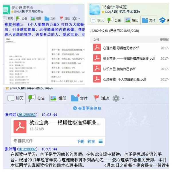 此次讀書活動以網絡(QQ、微信群)為平臺組建“愛心理讀書會”,心理輔導員定期推薦閱讀與大學生生活密切相關的心理書籍,將PDF電子版本的《個人覺醒的力量》、《習得性無助》、《認識自己,接納自己》和《就業寶典:根據性格選擇職業》等心理書籍傳至群共享,各班心理委員組織學生在固定時間進行線下集體閱讀,每個周三下午與心理輔導員進行線上溝通、答疑解惑,4月底各班提交讀書心得并開展全院讀書評比活動,達到吸引讀書、方便讀書的活動目的。