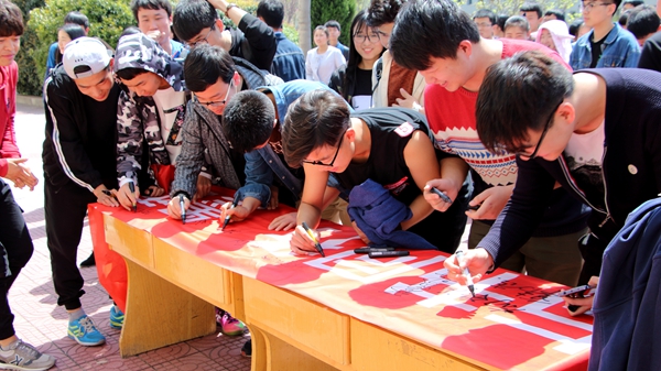 4月14日,數計學院團總支在二號教學樓前舉辦“與書同行,墨香存華”活動簽字儀式,2016級全體同學參加本次活動。