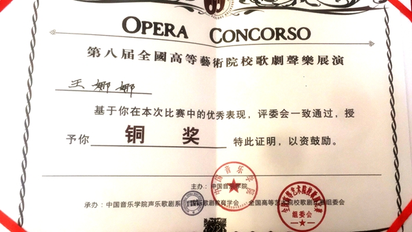 第八屆全國(guó)高等藝術(shù)院校歌劇聲樂比賽結(jié)果于近日揭曉,我校藝術(shù)學(xué)院教師王娜娜榮獲大賽銅獎(jiǎng)。