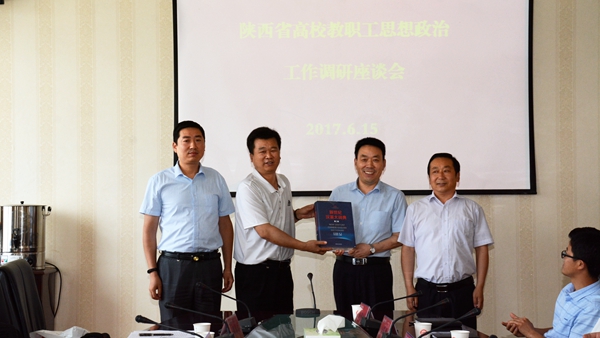 6月15日,由陜西省教育工會副主席陳鵬帶隊,由西安外國語大學工會主席趙沛、思政部副主任張親霞等一行7人組成的課題調研組來我校,對我校教職工思想政治工作開展調研。校黨委書記龍治剛會見了調研組成員。校黨委副書記、工會主席彭虎軍陪同會見,并與調研組進行座談。座談會由趙沛主持。