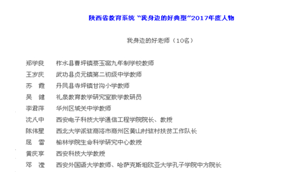 蘇霞等10名教師獲“‘我身邊的好典型’2017年度好老師”榮譽稱號,銅川市王益區黃堡鎮逸夫小學校長崔會婷等8名同志獲“‘我身邊的好典型’2017年度好校長(園長) ”榮譽稱號,陜西省自強中等專業學校顏學謙等18名學生獲“‘我身邊的好典型’2017年度好學生 ”榮譽稱號。