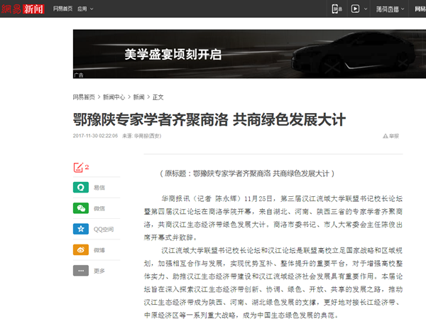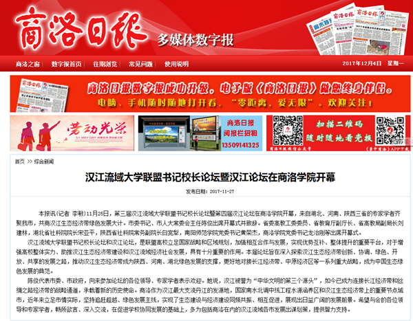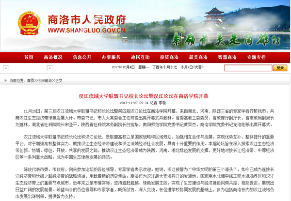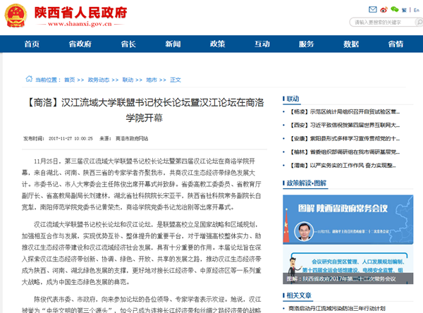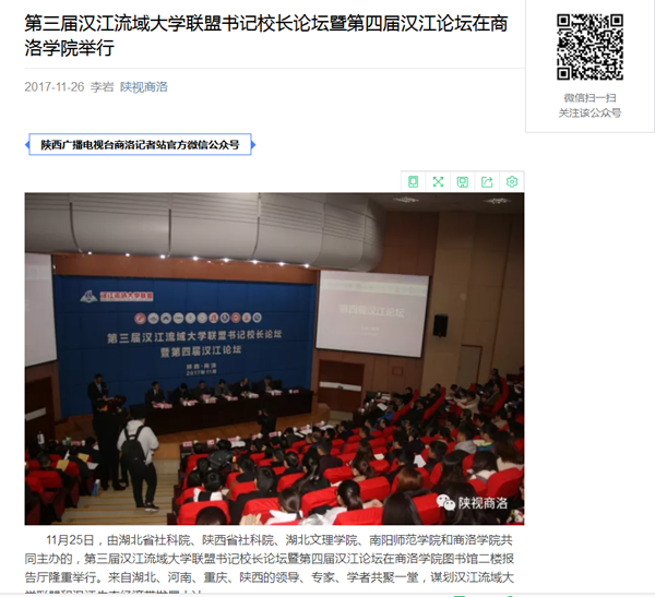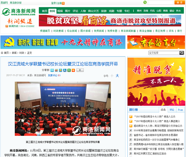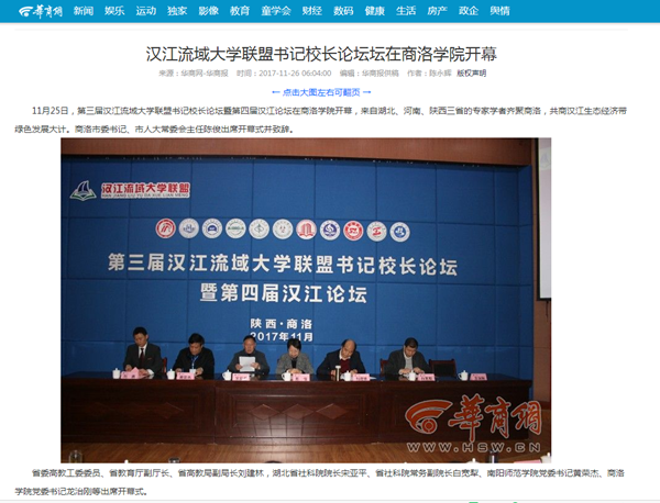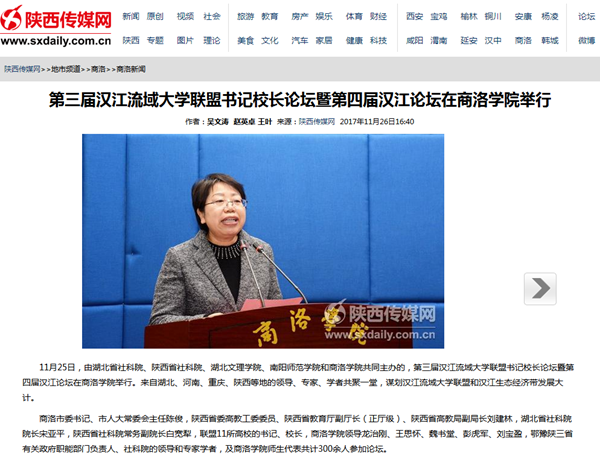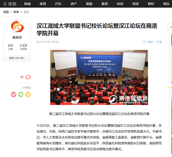 近日,網易、搜狐、中國社會科學網、陜西省人民政府網、陜西傳媒網、陜西電視臺、華商網、商洛市人民政府網、商洛日報、商洛新聞網、聯盟各單位網站等國家及地方主流資訊平臺,紛紛聚焦報道第三屆漢江流域大學聯盟書記校長論壇暨第四屆漢江論壇在我校的舉辦盛況,引起了社會各界對漢江生態經濟帶及漢江流域大學聯盟高校的更多關注,獲得了眾多網友為商洛學院紛紛點贊。