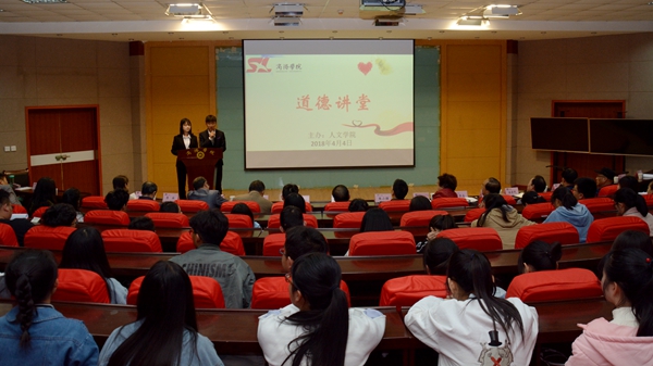 為進(jìn)一步培育和踐行社會主義核心價值觀,大力宣傳學(xué)習(xí)道德模范和身邊好人的感人事跡,增強(qiáng)思想政治工作實(shí)效性,我校決定開辦“道德講堂”,每月一期,由各二級學(xué)院輪流負(fù)責(zé)舉辦。4月4日,由人文學(xué)院負(fù)責(zé),以“贈人玫瑰,手有余香”為主題的第一期“道德講堂”順利舉辦。紀(jì)委書記王思懷出席活動,宣傳部負(fù)責(zé)人及各二級學(xué)院黨總支書記參加活動。