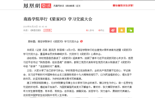 6月27日,我校召開慶祝建黨97周年表彰先進暨《梁家河》學習交流大會,師生同臺深情誦讀《梁家河》經(jīng)典章節(jié),重溫革命歷史和崢嶸歲月,交流學習《梁家河》心得體會,共聚一堂熱烈慶祝黨的生日。活動舉辦后,《陜西日報》、陜西省教育廳網(wǎng)站、陜西黨建網(wǎng)、中華誦網(wǎng)站、華商頭條、搜狐網(wǎng)、鳳凰網(wǎng)、三秦網(wǎng)、《商洛日報》等媒體紛紛進行報道,取得了良好的傳播效果,營造了濃厚的《梁家河》學習宣傳氛圍。