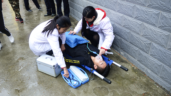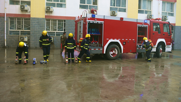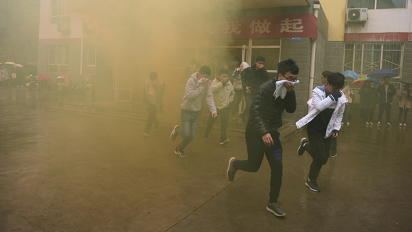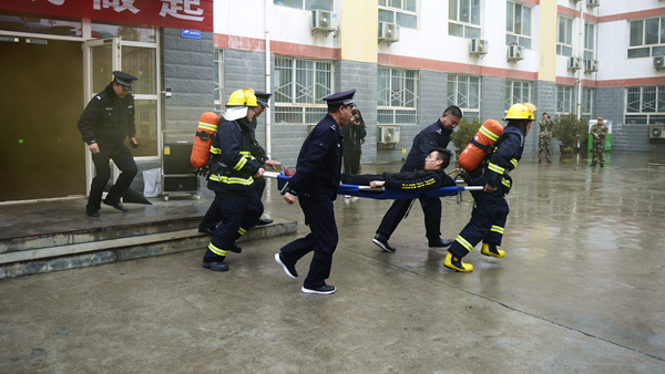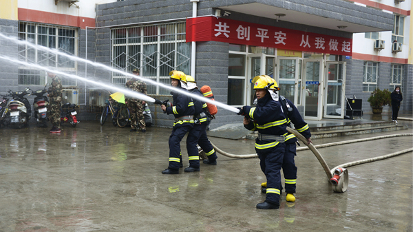 ?演練活動(dòng)以我校一棟男生公寓樓起火為假設(shè)情景,共分為“逃生演練”“火場(chǎng)救援”和“滅火演示”三個(gè)部分。隨著指揮員一聲令下,模擬活動(dòng)開始,“火災(zāi)現(xiàn)場(chǎng)”頓時(shí)濃煙滾滾,火險(xiǎn)警報(bào)響起,4名同學(xué)從“火災(zāi)現(xiàn)場(chǎng)”逃離出來并大聲呼救。我校立刻啟動(dòng)應(yīng)急預(yù)案,輔導(dǎo)員、公寓管理員、保衛(wèi)人員迅速趕到現(xiàn)場(chǎng),引導(dǎo)學(xué)生有序疏散,師生開展“逃生演練”進(jìn)行自救,并在第一時(shí)間撥打119火警電話。消防員接到報(bào)警后立即出動(dòng),駕駛消防車火速趕來。同學(xué)們聽從引導(dǎo),動(dòng)作迅速,用濕毛巾捂住口鼻,彎腰靠右側(cè)從“失火”的樓道中有序撤離到指定安全區(qū)域。隨后,消防人員還模擬演練了“火場(chǎng)搜救被困學(xué)生”,醫(yī)護(hù)人員對(duì)“被搜救學(xué)生”模擬進(jìn)行了“治療檢查”,消防支隊(duì)啟動(dòng)消防車在火災(zāi)現(xiàn)場(chǎng)進(jìn)行“滅火演示”。至此,在各相關(guān)部門的密切合作和全體同學(xué)的共同配合下,本次火災(zāi)應(yīng)急疏散與救援演練活動(dòng)圓滿完成。