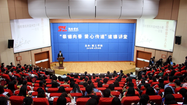 活動在《公民道德歌》悠揚(yáng)的歌聲中拉開序幕。隨后,學(xué)生代表朗誦《道德之歌》《道德經(jīng)》,在場師生共同觀看了2017年感動中國十大人物溫州“蘭小草”的頒獎(jiǎng)視頻和我校最美學(xué)子、“中國好人”唐偉麗的事跡視頻。學(xué)生代表王欣表示,作為青年大學(xué)生,在今后的學(xué)習(xí)和生活中要以道德楷模為榜樣,從現(xiàn)在做起,從身邊的小事做起,做一名崇德向善、傳遞愛心的人。