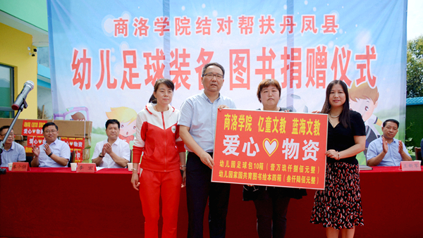 7月9日,我校與武漢億童文教有限公司、陜西藍(lán)海文教科技有限公司攜手為丹鳳縣棣花鎮(zhèn)兩嶺幼兒園送去愛(ài)心足球運(yùn)動(dòng)包、愛(ài)心圖書(shū)等價(jià)值貳萬(wàn)多元的物資。校雙百工程領(lǐng)導(dǎo)小組組長(zhǎng)、黨委書(shū)記龍治剛,副組長(zhǎng)、副校長(zhǎng)劉寶盈,丹鳳縣副縣長(zhǎng)楊思飛,武漢億童文教有限公司、陜西藍(lán)海文教科技有限公司顧問(wèn)專家趙小紅等領(lǐng)導(dǎo)嘉賓出席捐贈(zèng)儀式。我校科技處、體育教學(xué)研究部及丹鳳縣少兒足球項(xiàng)目負(fù)責(zé)人,丹鳳縣科教體局黨政負(fù)責(zé)人,丹鳳縣農(nóng)業(yè)局相關(guān)負(fù)責(zé)人等工作人員與兩嶺幼兒園全體師生家長(zhǎng)共同參加了捐贈(zèng)活動(dòng)。