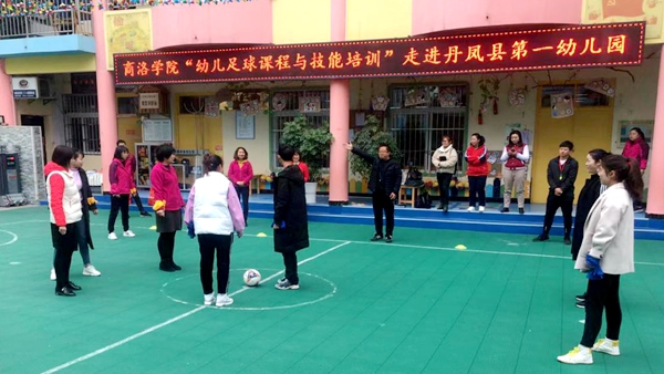 為進一步做好結對幫扶助力丹鳳脫貧攻堅工作,推進丹鳳縣幼兒足球示范園建設,我校與丹鳳縣科教體局于11月20日在丹鳳縣第一幼兒園共同舉辦了“幼兒足球課程與技能培訓”活動。我校“雙百工程”項目首席專家朱小強,體育教學研究部足球教師楊斌,丹鳳縣農業農村局、科教體局相關人員,丹鳳縣5所示范園和5所民辦幼兒園負責人及相關教師參加了此次活動。