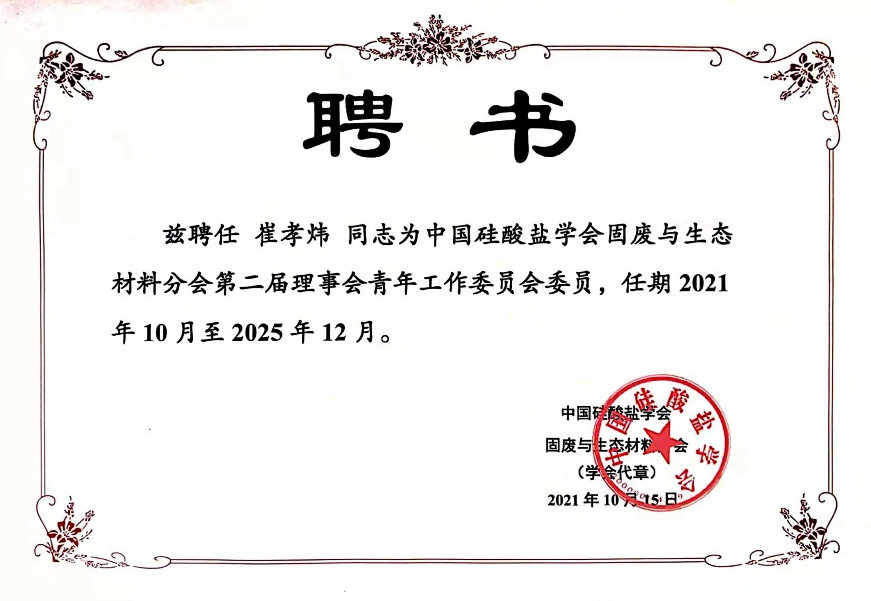 10月15日-17日,第四屆中國固廢處理與生態材料學術與技術交流會在武漢召開,會議推舉審定了第二屆中國硅酸鹽學會固廢與生態材料分會理事會建筑固廢學術委員會名單(110名),我校化材學院副院長崔孝煒博士受邀線上參會,并在會上被聘為中國硅酸鹽學會固廢與生態材料分會第二屆理事會青年工作委員會委員。