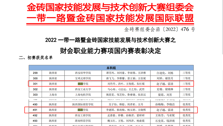 近日,“2022一帶一路暨金磚國(guó)家技能發(fā)展與技術(shù)創(chuàng)新大賽”等多項(xiàng)財(cái)會(huì)類專業(yè)高水平競(jìng)賽結(jié)果陸續(xù)公布,我校經(jīng)濟(jì)管理學(xué)院參賽師生捷報(bào)頻傳,在4項(xiàng)競(jìng)賽中榮獲省級(jí)獎(jiǎng)勵(lì)。