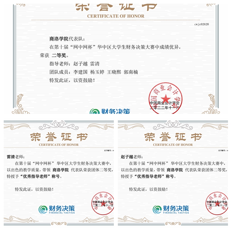第十屆“網(wǎng)中網(wǎng)杯”大學(xué)生財(cái)務(wù)決策大賽由中國(guó)高等教育學(xué)會(huì)高等財(cái)經(jīng)教育分會(huì)指導(dǎo),中國(guó)商業(yè)會(huì)計(jì)學(xué)會(huì)主辦,廈門網(wǎng)中網(wǎng)軟件有限公司等單位提供技術(shù)支持,全國(guó)共有372所本科院校參賽。我校經(jīng)濟(jì)管理學(xué)院李建國(guó)、楊玉婷、王曉熙、郭南楠4名學(xué)生獲得華中區(qū)團(tuán)體二等獎(jiǎng),雷清、趙子越榮獲“優(yōu)秀指導(dǎo)教師”稱號(hào)。