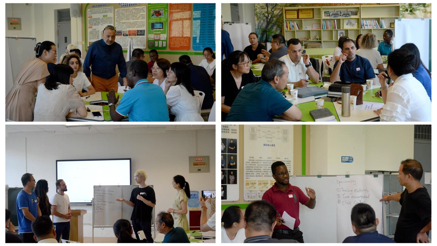 活動第一階段,Arshad Imtiaz以“你認為教師的角色是什么?”為題進行熱身活動,隨后結合實例講解了對教學法的認識。第二階段,以“教師、課堂、學生最佳做法”為題進行小組討論,并分組進行展示。每個小組中外教師混合組隊,都以教師、課堂和學生這三點切入分別講解他們認為的最佳做法。在近三個小時的活動過程中,教師們全程英文交流,討論氣氛熱烈,各組展示各有側重,掌聲此起彼伏。