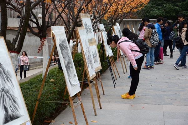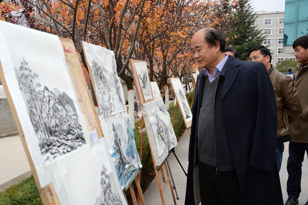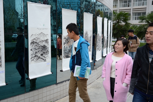 11月13日,我校1號教學樓前的通道兩側擺出了百余幅山水寫生國畫,引得過往師生紛紛駐足觀賞。這是由藝術學院舉辦的“秦嶺山水寫生掠影”作品展,匯集了美術學2013級105名學生的課程實踐作品。校黨委書記、校長劉建林,黨委副書記彭虎軍參觀了畫展并對我校學生的作品給予了高度評價。