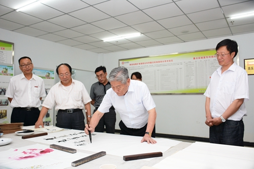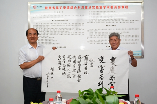 參觀時,趙鵬大院士親筆為重點實驗室題寫“變廢為寶,變害為利”,并祝愿我校尾礦資源綜合利用重點實驗室建成國內一流、世界先進的實驗室。化材學院黨總支書記劉全民代表師生向趙鵬大院士贈送書法繪畫作品。