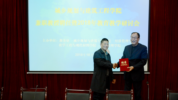 10月31日,城鄉規劃與建筑工程學院兼職教授聘任暨2018年教育教學研討會順利舉行,西安建筑科技大學白國良教授在會上受聘為我校兼職教授。校長范新會出席聘任儀式并為白教授頒發聘書。校黨委委員、教務處處長李超,校黨委委員、城鄉規劃與建筑工程學院院長楊存典及人事處相關負責人參加了聘任儀式。聘任儀式由李超主持。