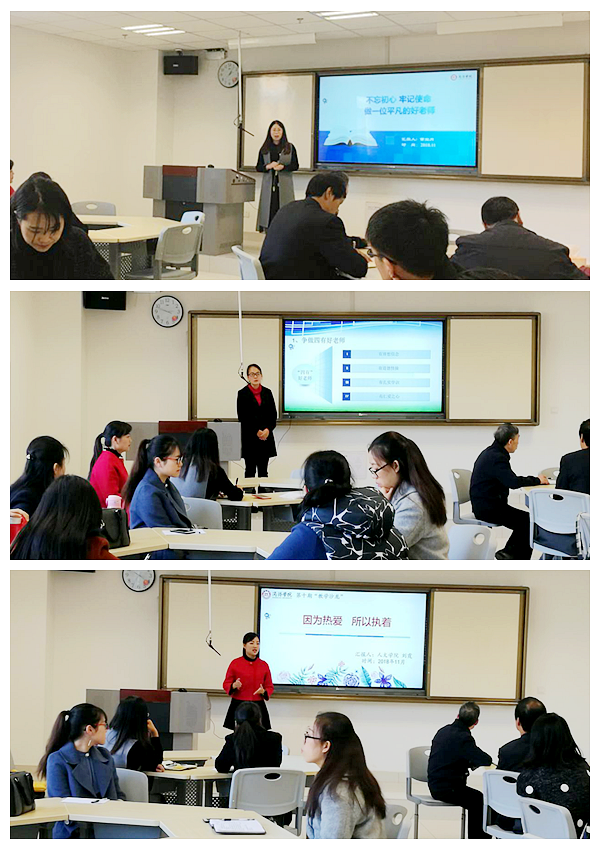 陜西省“課程思政”標兵曹寶月老師以“不忘初心,牢記使命,做一位平凡的好老師”為主題,從立德樹人、教育創(chuàng)新,用心選擇參賽課題,潛心設計教學方案,傾心完成教學過程四個方面分享了自己在課堂教學中的具體做法及參加教學大賽的實戰(zhàn)經(jīng)驗;陜西高等學校青年教師教學競賽一等獎獲得者李亞文老師以“做‘四有’好老師,鑄造有效課堂”為主題,從如何做“四有”好老師、怎樣提高教學質量、參加教學競賽的關鍵點三個方面交流了自己的心得體會;學校首屆課堂教學創(chuàng)新大賽一等獎獲得者劉霞老師以“因為熱愛,所以執(zhí)著”為主題,結合自己在教學中遇到的實際案例,從做走近學生的老師、做改革創(chuàng)新的老師、做堅持初心的老師三個方面講述了自己在創(chuàng)新課堂教學方法、準備教學大賽中的經(jīng)歷和體悟。
