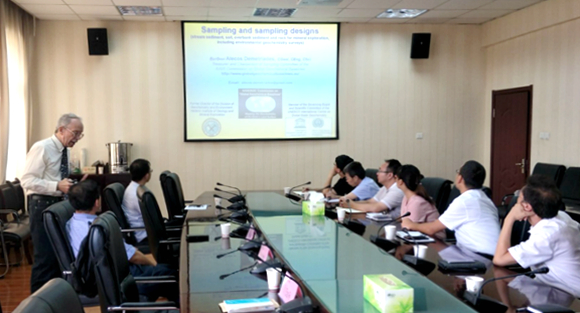 座談會后,Dr. Zhang Chaosheng以《大數(shù)據(jù)時代基于機器學(xué)習(xí)的地球化學(xué)變量的空間分析》為題作了學(xué)術(shù)報告,Prof. Alecos Demetriades以《采樣和采樣設(shè)計》《如何撰寫英文論文》為題作了兩場學(xué)術(shù)報告。報告后,地理專業(yè)教師們圍繞大數(shù)據(jù)處理、機器學(xué)習(xí)、空間變異、地球化學(xué)研究與采樣方法、論文寫作等方面與兩位專家進行了深入交流,報告會氣氛活躍,效果良好。