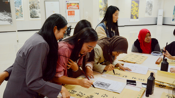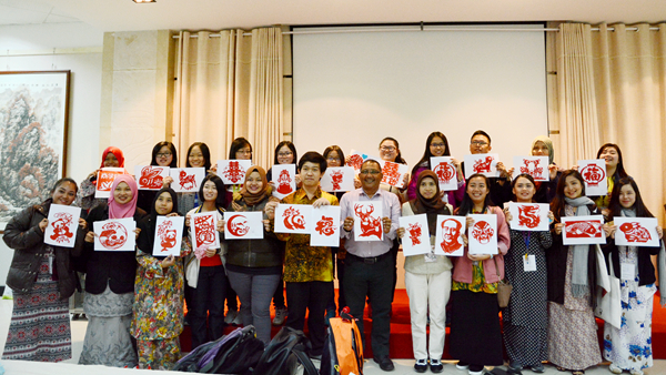 16日下午,交流團師生聽取了中國傳統禮儀課,并與我校師生共同探討、展示了中馬兩國不同的禮儀;之后在我校教師的指導下學習中國書法和剪紙。他們在課堂上呈現出了濃厚的興趣和極高的熱情,并通過學習,完成了自己的書法和剪紙作品。