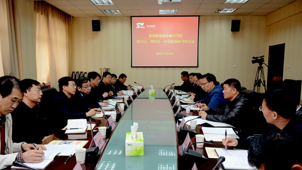 3月29日,西安航空學院黨委書記陳平社、校長曹慶年、副校長宋文學等一行9人來我校考察交流工作。校黨委書記龍治剛、校長范新會熱情接待了陳平社、曹慶年一行。