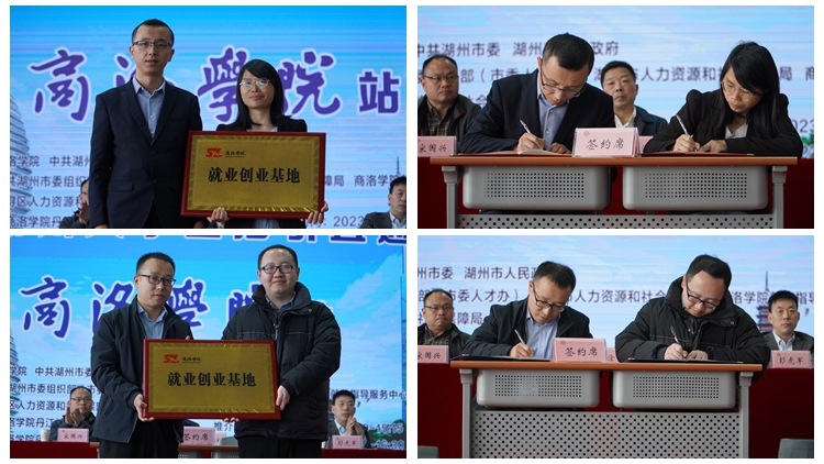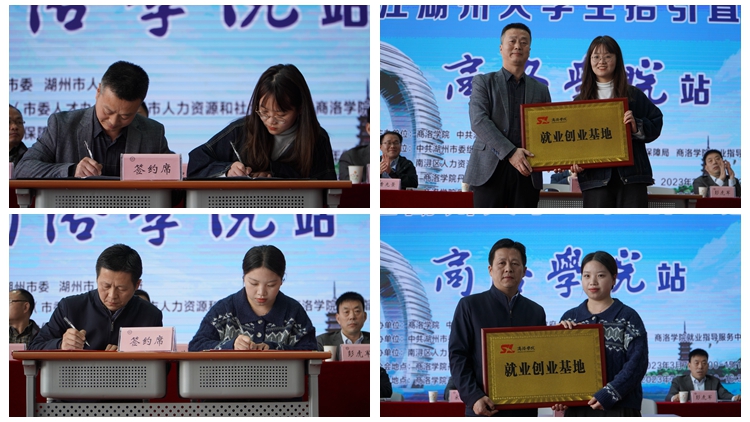 會上,電信學院、化材學院、生物學院、經管學院分別與浙江華遠微電科技有限公司、久立集團股份有限公司、長興太湖龍之夢虹峰酒店投資管理有限公司及湖州嘉亨實業有限公司簽訂了大學生就業創業基地建設協議。