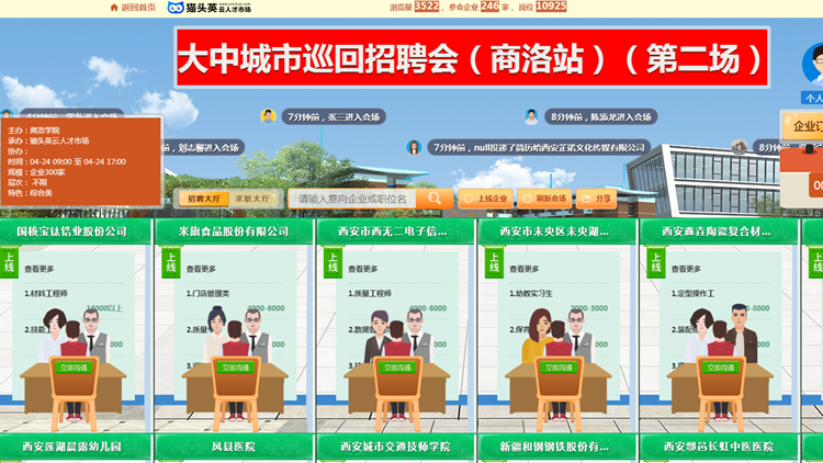 本次招聘會(huì)依托貓頭英云就業(yè)平臺(tái)開展,吸納了省內(nèi)外246家用人單位參會(huì),其中包括河南國(guó)控建設(shè)集團(tuán)有限公司、國(guó)核寶鈦鋯業(yè)股份公司、寧夏建龍?zhí)劁撚邢薰尽㈥兾鞯氐V第二工程勘察院有限公司等業(yè)內(nèi)知名企業(yè)以及西安城市交通技師學(xué)院、西安信息工程技師學(xué)院等師范教育類用人單位,為我校畢業(yè)生提供土木土建、師范教育、電子商務(wù)、外語(yǔ)外貿(mào)、學(xué)前教育、電氣工程、金融會(huì)計(jì)、化學(xué)化工、生物醫(yī)藥等多個(gè)行業(yè)領(lǐng)域的有效對(duì)口崗位達(dá)6930多個(gè)。招聘會(huì)開展期間,我校1787名畢業(yè)生參會(huì),在線參加面試926人(次),達(dá)成初步就業(yè)意向334人(次)。