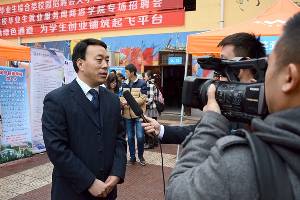 彭虎軍在招聘會期間接受了電視臺專訪。他指出,我校一貫重視大學生就業工作,通過落實完善就業創業政策,加大資金投入,積極促進大學生自主創業。不斷加強大學生就業服務和指導,以舉辦就業形勢與政策報告會、邀請就業創業專家進校園等方式宣傳大學生就業政策,促進大學生就業觀念的轉變。通過舉辦各類招聘會促進大學生就業,近期連續舉辦了4場招聘會,提供就業崗位6000多個。他表示,有黨和政府促進大學生就業的良好政策,有社會各界的大力支持,有廣大學生的積極努力,我校畢業生一定能夠實現更充分更高質量的就業創業。