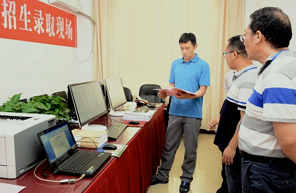 7月11日,副校長(zhǎng)劉勇在黨委委員、教務(wù)處處長(zhǎng)李超等人的陪同下到我校2018年高考招生錄取現(xiàn)場(chǎng)檢查指導(dǎo)招生錄取工作,慰問(wèn)招生錄取工作人員。