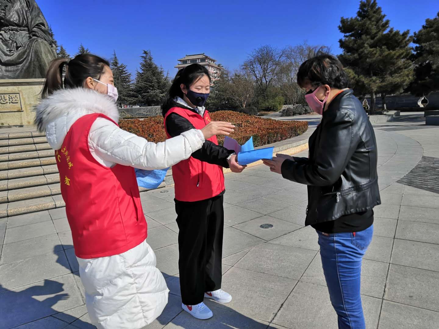 焦思娟與同伴一起發放疫情防控宣傳冊
