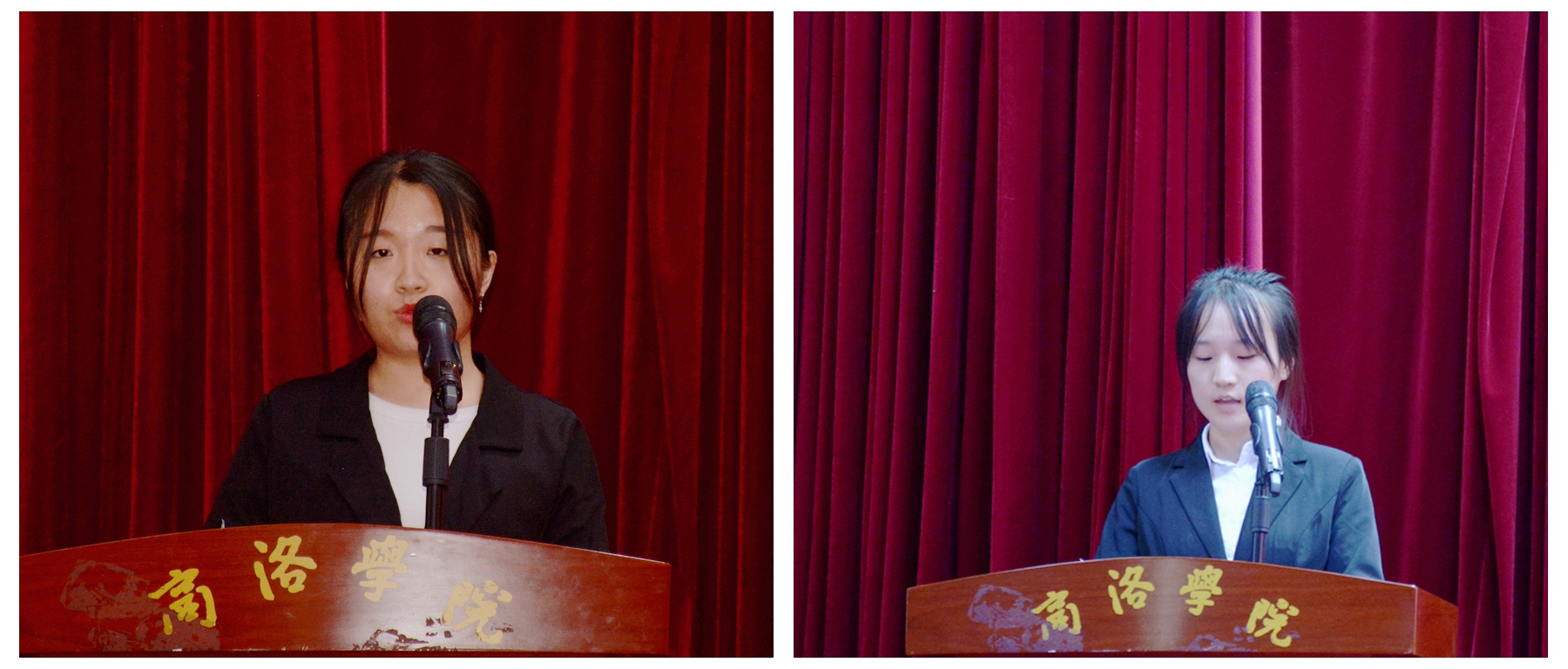 “十佳大學生”榮譽稱號獲得者制藥1801班楊瑩瑩、“正德篤行”獎學金獲得者會計1802班趙翡翡兩名學生分別代表受表彰的先進個人和受獎受助學生作了發言。