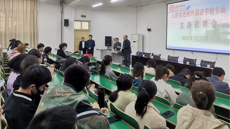 3月23日,廣東省云浮市光明外國語學校校長梅永華、校辦主任劉偉華等一行4人來到我校,舉辦專場宣講招聘會,為我校畢業生帶來53個就業崗位。2021屆教育類相關專業200余名畢業生參加了招聘會。這是我校積極踐行“以生為本”工作理念,充分克服疫情對畢業生就業帶來的不利影響,為畢業生舉辦的小規模、多場次招聘會中一場。