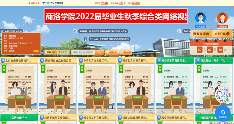 本次網絡視頻招聘會共有西安建工第五建筑集團有限公司、中航鋰電科技有限公司、北京聰明核桃教育科技有限公司、永壽高新醫院等省內外300家用人單位參會;提供涉及文體教育、IT通信、醫療衛生、建筑工程、信息服務、機電制造等9大行業領域的就業崗位2萬余個;吸引了近2000余名校內外畢業生參會,累計投遞簡歷3239份。