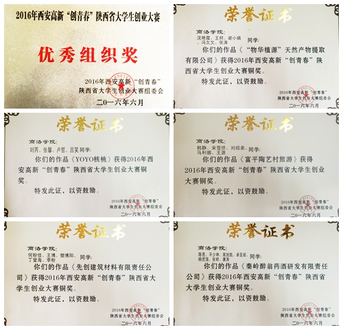 6月2日,2016年西安高新“創(chuàng)青春”陜西省大學(xué)生創(chuàng)業(yè)大賽頒獎典禮在西北大學(xué)舉行。我校學(xué)生的《秦嶺醉翁藥酒研發(fā)有限責(zé)任公司》《先創(chuàng)建筑材料有限責(zé)任公司》《商洛YOYO核桃觀光工廠》《陜西富平陶藝村專線旅游服務(wù)》《物華植源天然產(chǎn)物提取有限公司》等五個項目榮獲銅獎,學(xué)校獲得“優(yōu)秀組織獎”。