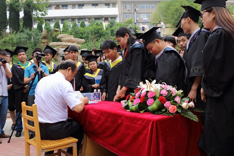 在莘子苑入口,畢業生排隊熱烈歡迎劉建林校長。劉建林現場向畢業生贈送了自己編著的《跨流域調水工程補償機制研究——以南水北調(中線)工程商洛水源為例》一書,并在書上題寫了“膽大心細,精打細算”的贈語及簽名。簽名贈書現場人頭攢動,畢業生們圍繞在劉建林身邊,爭先恐后領取贈書。拿到劉校長親筆簽名的書籍,同學們臉上流露出了激動和幸福的表情。