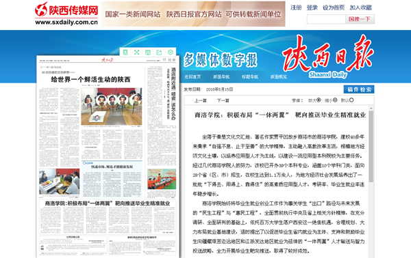 5月15日,《陜西日報》第11版以《商洛學院:積極布局“一體兩翼”    靶向推送畢業生精準就業》為題,對我校就業工作進行了專題報道。