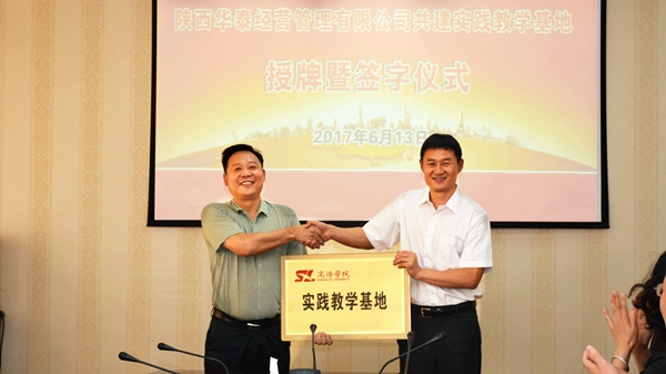 6月13日,我校與陜西華泰經營管理有限公司共建實踐教學基地授牌暨簽字儀式在學校四樓會議室舉行。副校長劉勇向陜西華泰經營管理有限公司董事長李仁斌授牌。教務處處長李超與陜西華泰經營管理有限公司總經理閆博簽訂合作協議。儀式由經管學院副院長王怡主持。經管學院、建工學院教師代表參加活動。