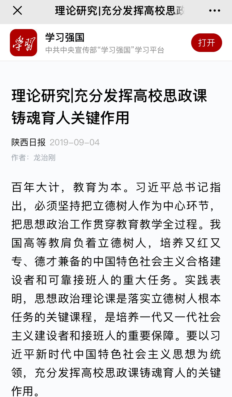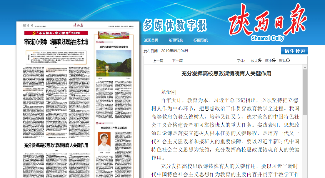 黨委書記龍治剛在《陜西日報》2019年9月4日第6版發(fā)表理論文章《充分發(fā)揮高校思政課鑄魂育人關(guān)鍵作用》,學習強國平臺全文轉(zhuǎn)載。文章內(nèi)容如下: