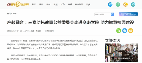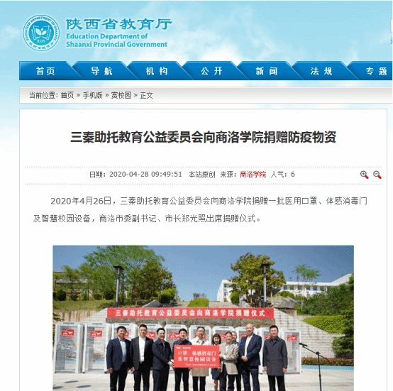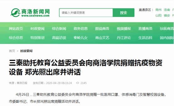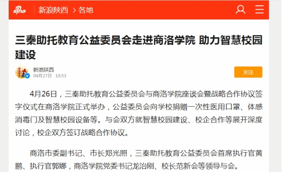 近日,陜西廣播電視臺、陜西省教育廳網站、西部網、華商網、新浪網、搜狐網、《商洛日報》、商洛市人民政府網站、頭條新聞、中華網等省市10余家媒體及部分自媒體平臺對三秦助托教育公益委員會向我校捐贈防疫物資和智慧校園設備的情況進行了廣泛宣傳報道。