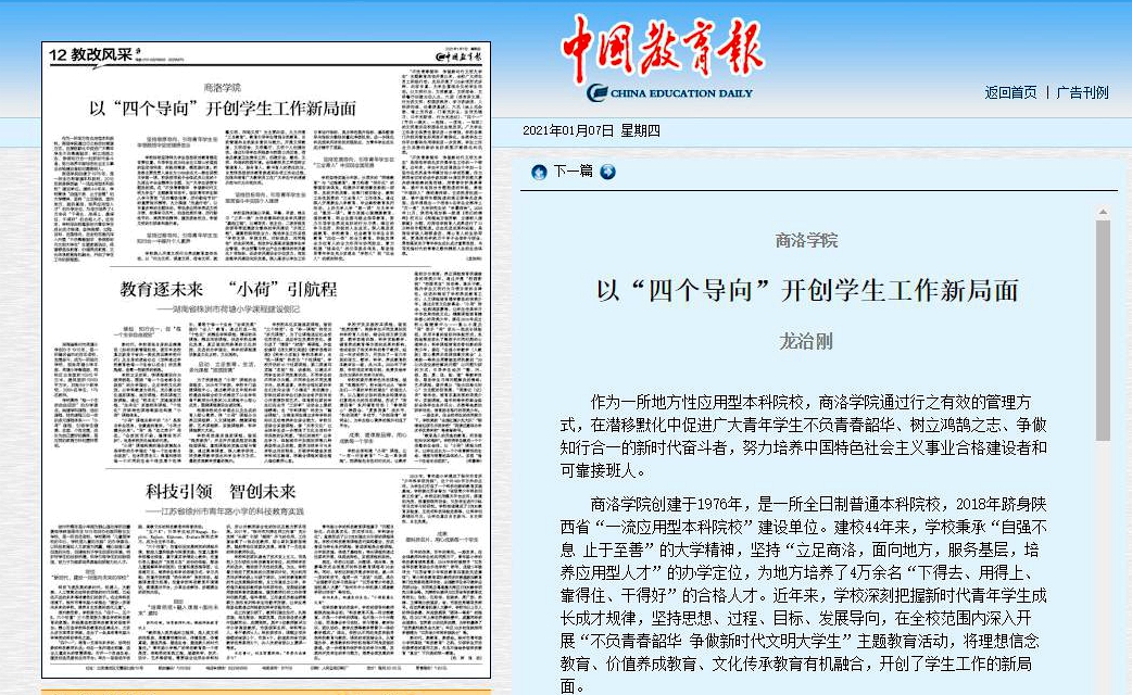 1月7日,校黨委書記龍治剛在《中國教育報》教改風采版面發表署名文章《商洛學院:以“四個導向”開創學生工作新局面》。