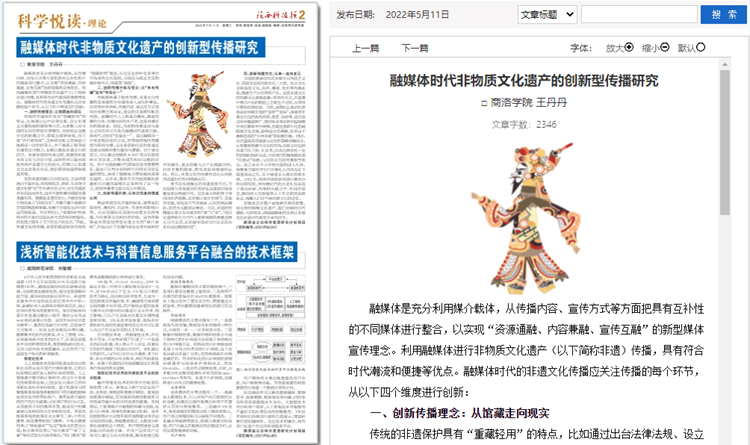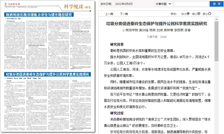 5月份以來,我校教師袁訓鋒、田祎、王丹丹先后在《陜西科技報》理論版刊發《垃圾分類促進秦嶺生態保護與提升公民科學素質實踐研究》《商洛市科普信息化建設研究》《融媒體時代非物質文化遺產的創新型傳播研究》三篇文章,圍繞秦嶺生態保護、科普信息化建設、非物質遺產創新傳播等主題,介紹我??蒲蟹盏胤綄嵺`成果和經驗。文章主要內容如下: